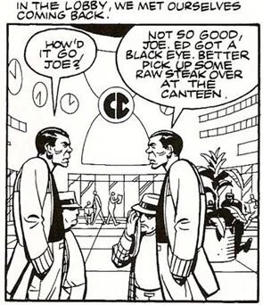 In this panel, both characters meet future versions of themselves, from later in the story, and discover that Ed has a black eye:.