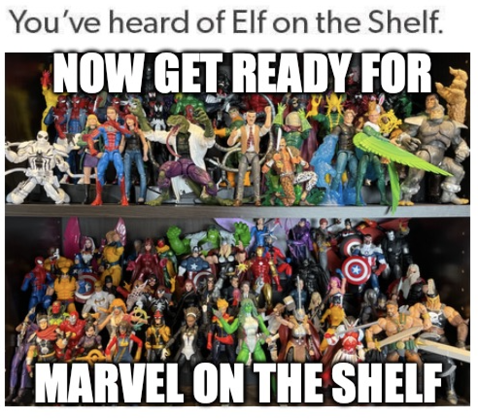 You might have heard of the Christmas meme tradition, ‘elf on the shelf,’ now get ready for my rhymeless, less catchy, and all year-round version, ‘Marvel on the shelf’ – or, more playfully, ‘Marvel at the shelf’.