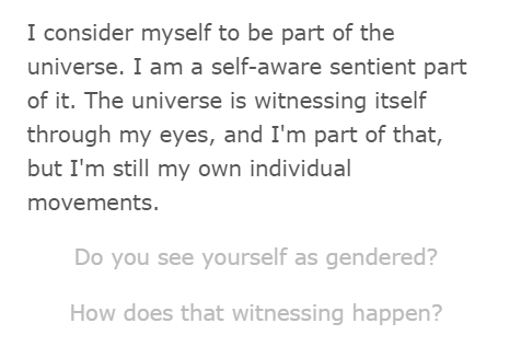 By presenting a large number of characters for the player/user to interact with, I hope to contribute to a database narrative about transgender ways of being and seeing, and give people (cis and trans alike, because not all trans people have access to a larger trans community) a window into an expansive sekaikan, and perhaps an expansive worldview. Transmediating oral testimonies into videogame characters invites people into a context where they accept that they do not know everything about how this world functions—in videogames, you build up a database narrative about the storyworld in a bottom-up manner, rather than imposing top-down assumptions. Perhaps if we could learn to more readily do this in our own consensual reality, we might give people more space to define themselves for themselves.