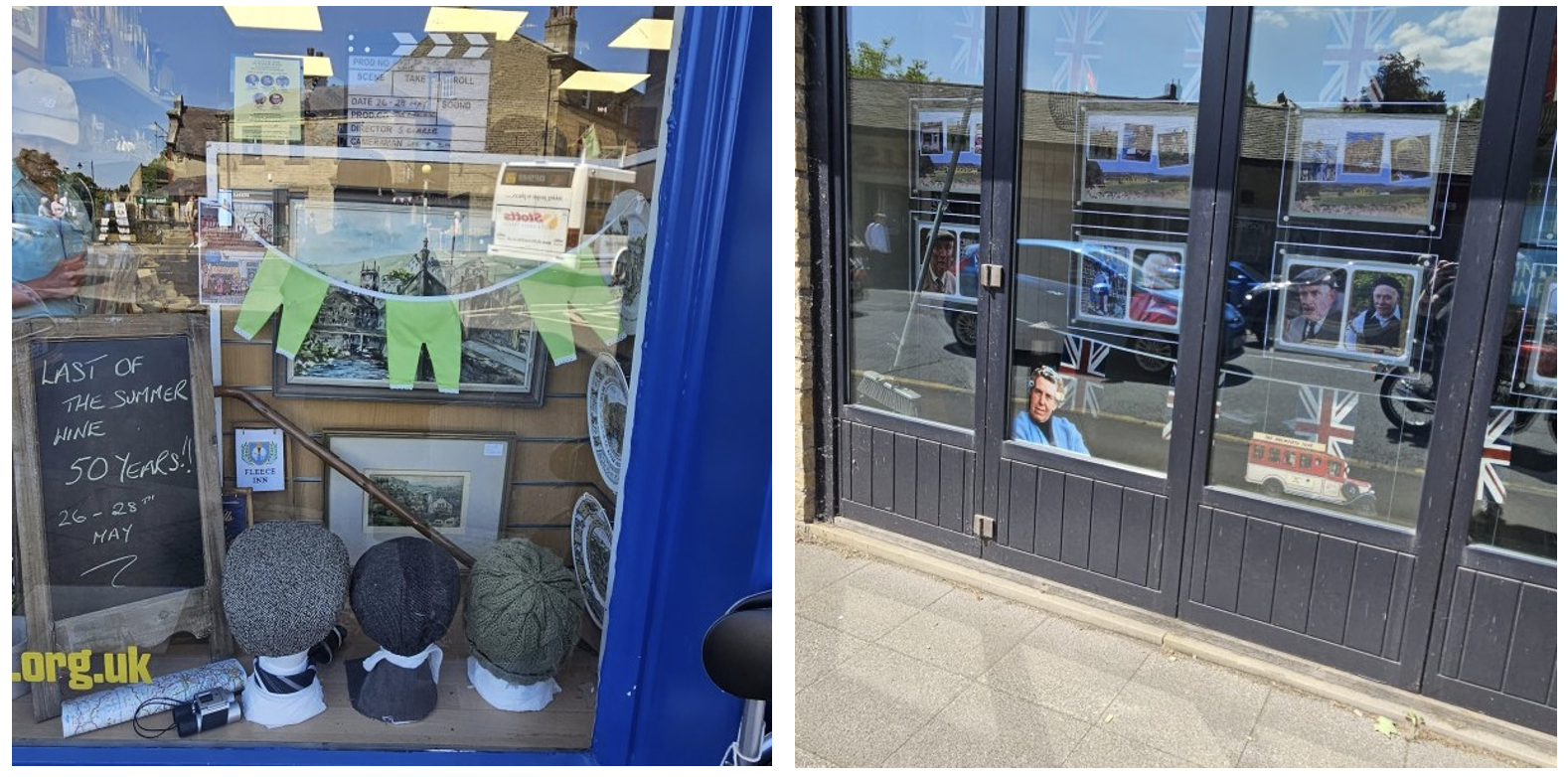 Holmfirth has long embraced Last of the Summer Wine and its tourist legacy. A down-at-heel industrial town facing the loss of its woollen mill when the series first began filming there in the 1970s, it saw increasing numbers of tourists in the show’s first decade - 60,000 a year, according to Andrew Vine. As the show’s popularity increased so did the work opportunities for locals and the income from the rising number of visitors, transforming Holmfirth into a once-again prosperous town and cementing its position at the heart of “Last of the Summer Wine country”. As academics Lynne Hibberd and Zoe Tew-Thompson describe, the show has become “inscribed, embedded and appropriated into the town of Holmfirth and its people”, evidence of which was clear during the 50th anniversary weekend. A window display in one charity shop featured a walking stick, flat cap, and green knitted bobble hat – signature accessories of the main characters – along with a clapperboard announcing the 50th anniversary weekend while a flower shop peppered framed illustrations of key characters and locations among cacti and house plants. A local estate agent dedicated an entire window to the show, and bunting in the shape of frilly bloomers hung everywhere.