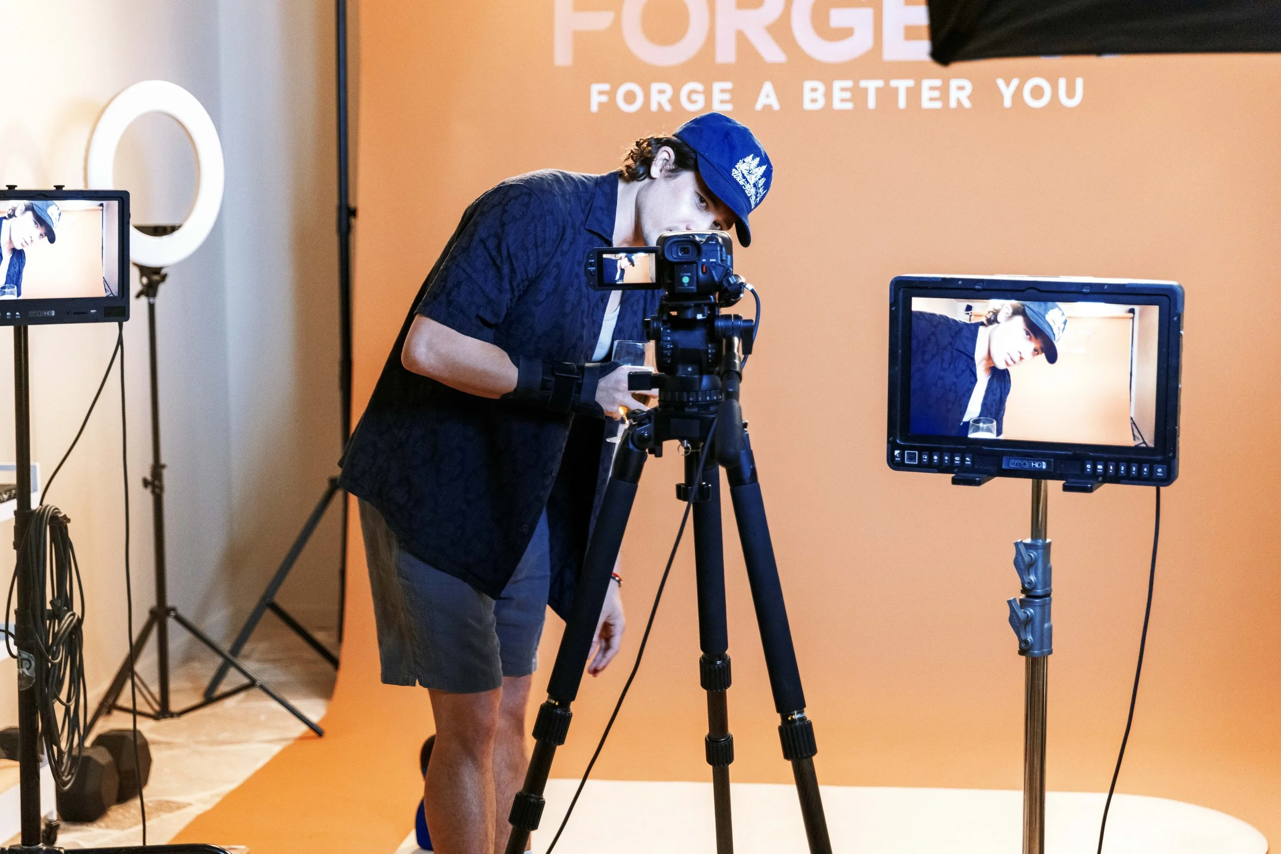 Chai Hansen as Cain, looking down the lens and seen through playback screens against the ForgeFit backdrop. Stills Lisa Tomasetti.